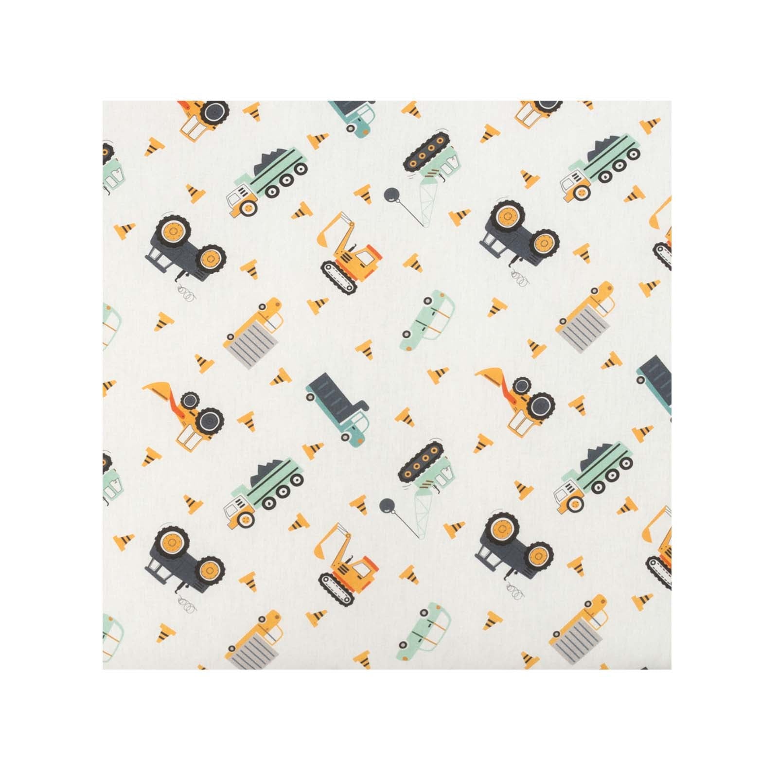 Stof Bram is 150 cm breed, 115 g/m² geweven katoen met een print vol werkvoertuigen.