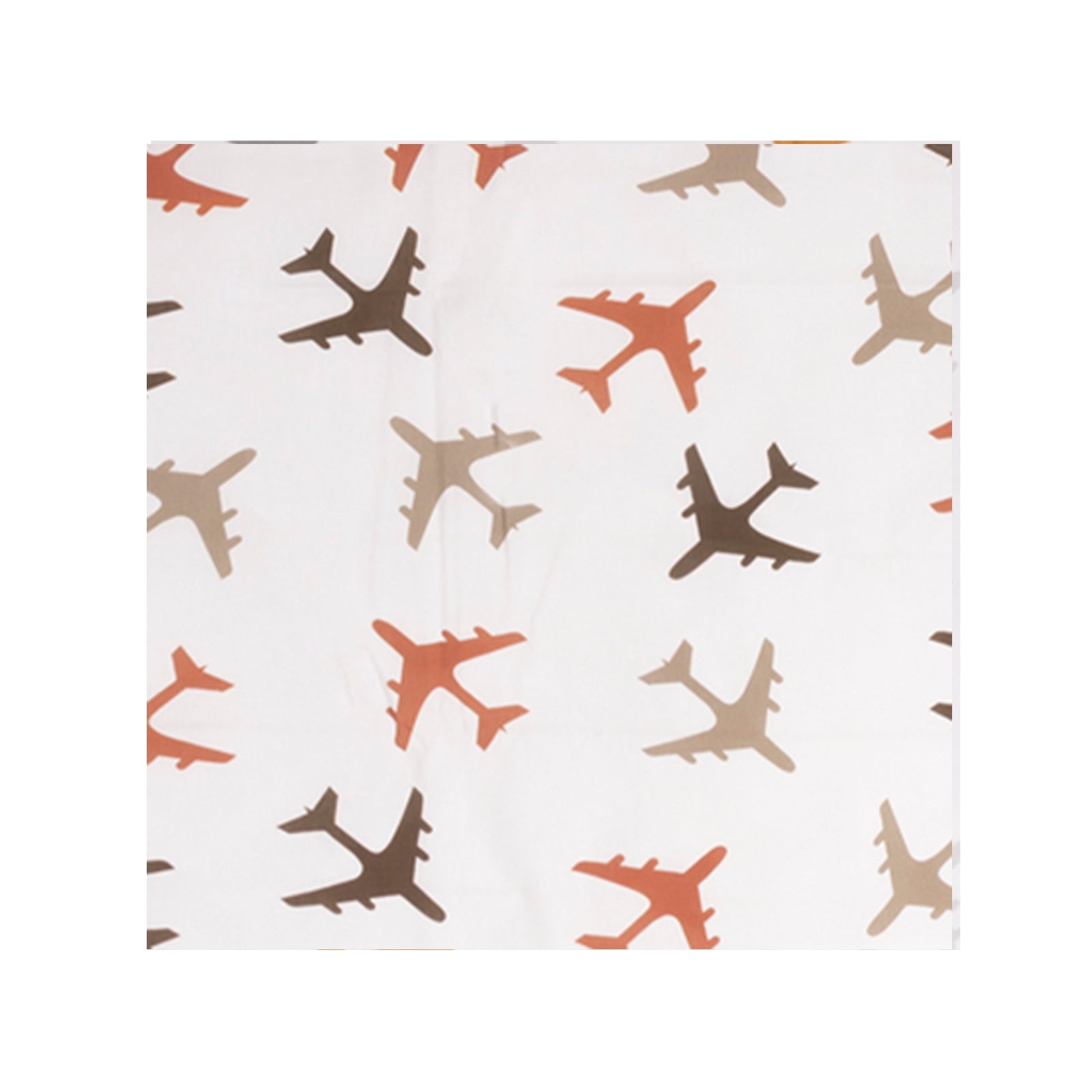 Stof Planes choco is 150 cm breed, 115 g/m² geweven katoen met een vrolijke vliegtuigen print.