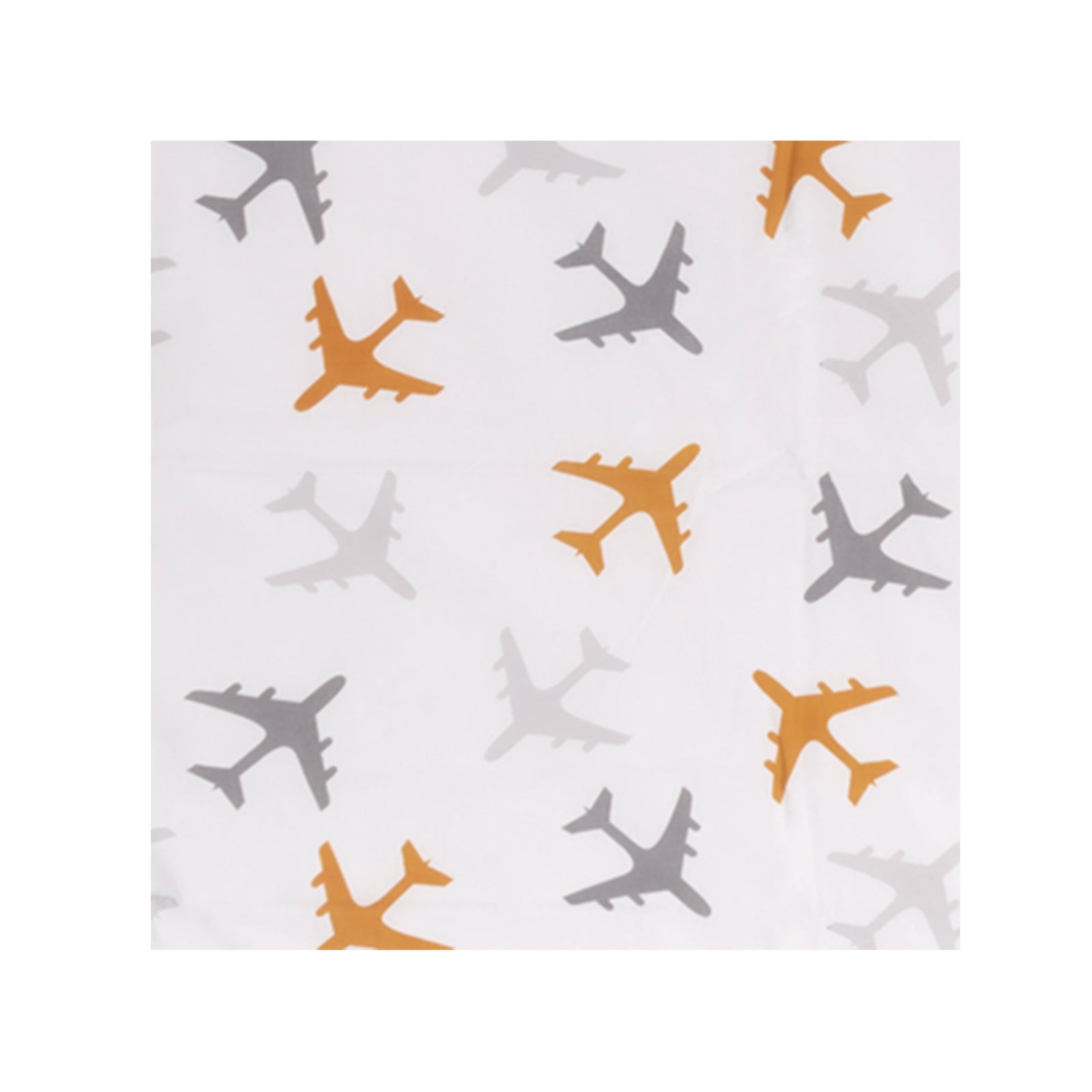 Stof Planes oker is 150 cm breed, 115 g/m² geweven katoen met een vrolijke vliegtuigen print.