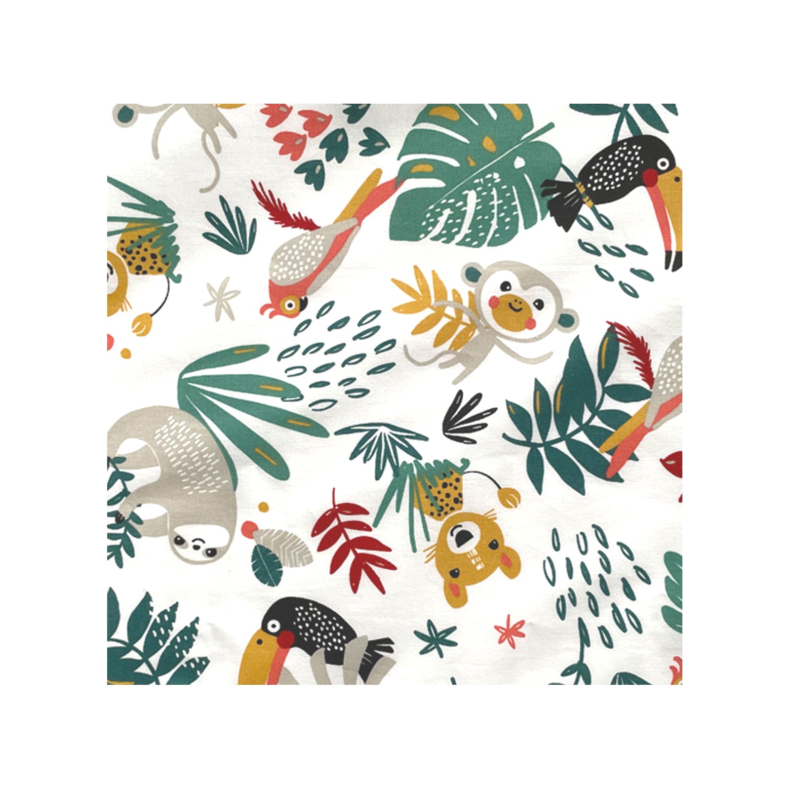 Stof Zoë is 150 cm breed, 115 g/m² geweven katoen met een vrolijke print met dieren.