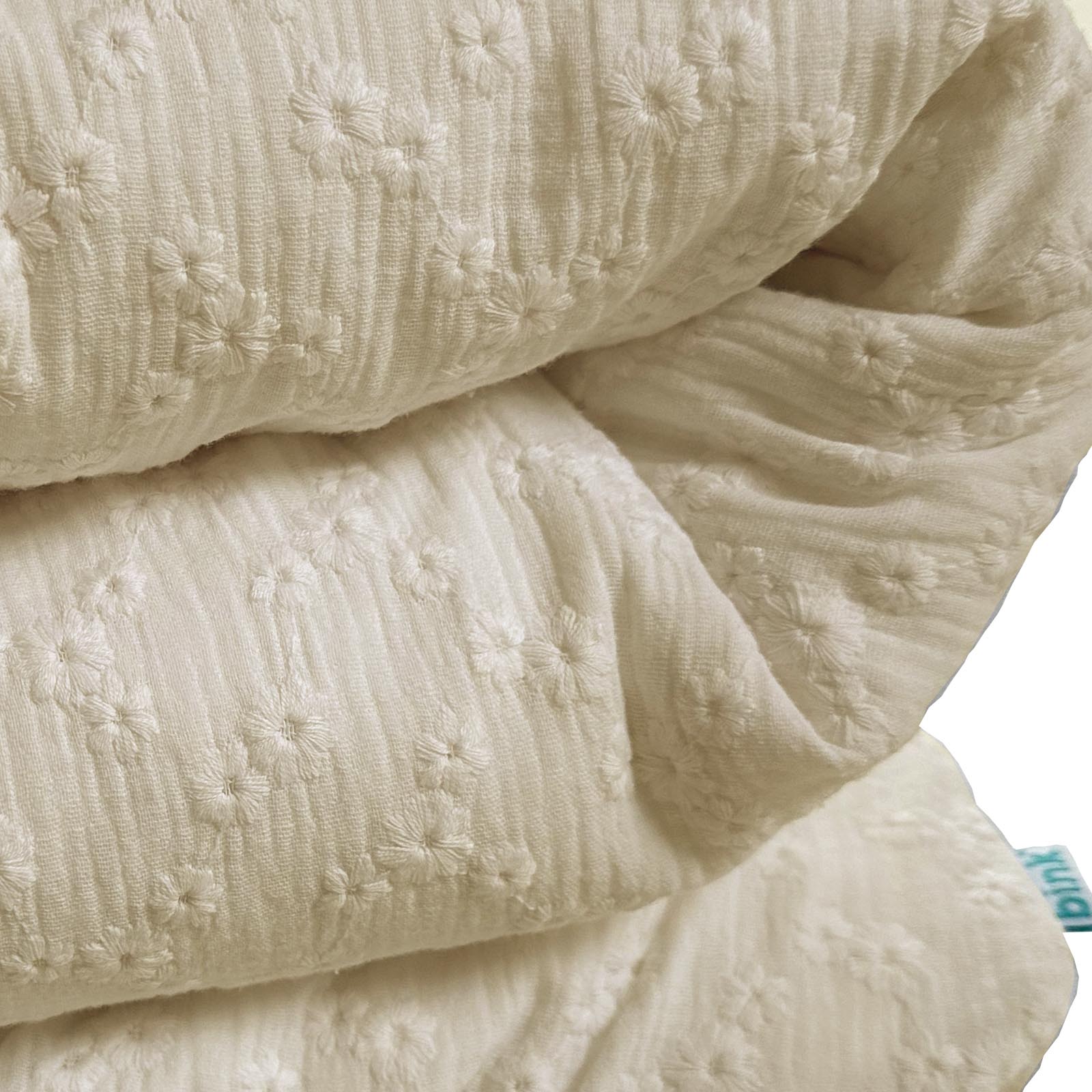 Dekbedovertrek Esmee ecru heeft aan de voorzijde een prachtige mouseline hydrofiel met geborduurde bloemen. De onderzijde is uni ecru katoen.