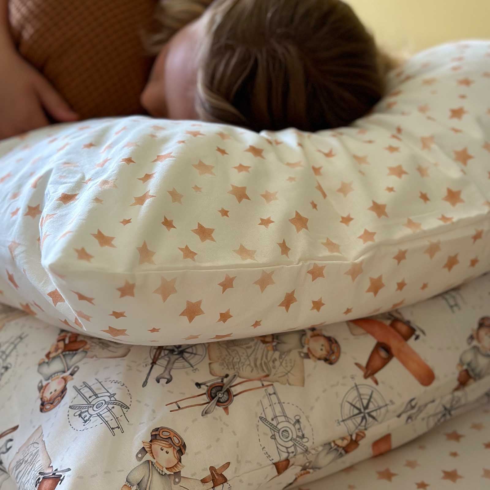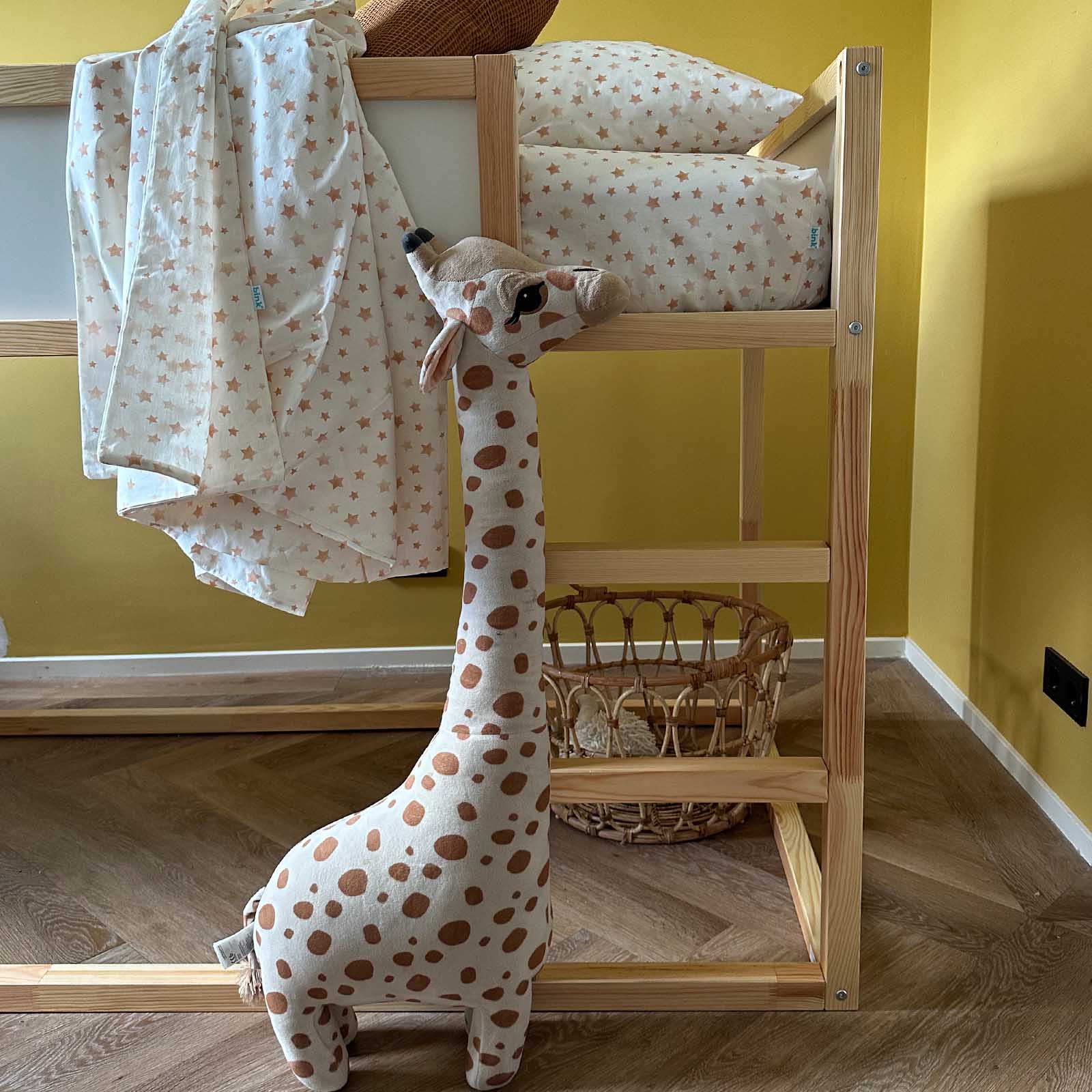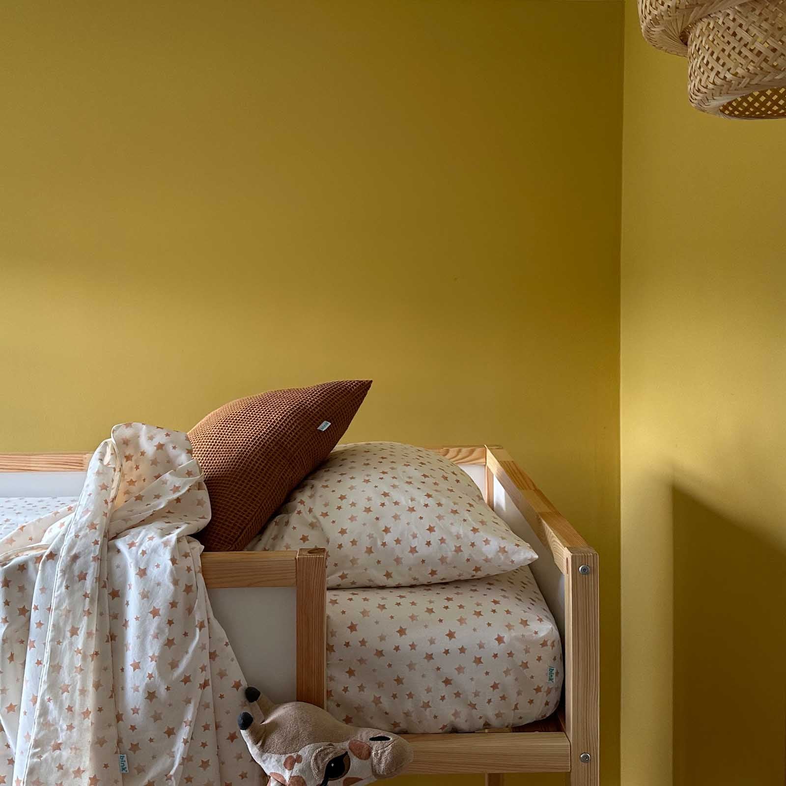 Dekbedovertrek Sterre heeft aan beide zijde de terra/oranje kleurige sterren print. De sterren zijn op een aquarel-achtige manier geprint waardoor ze een speelse look geven aan het dekbedovertrek. Dekbedovertrek Sterre heeft een ecru ondergrond waardoor de sterren een zachte look krijgen. Een dekbedovertrek waar je zo onder zou willen kruipen!