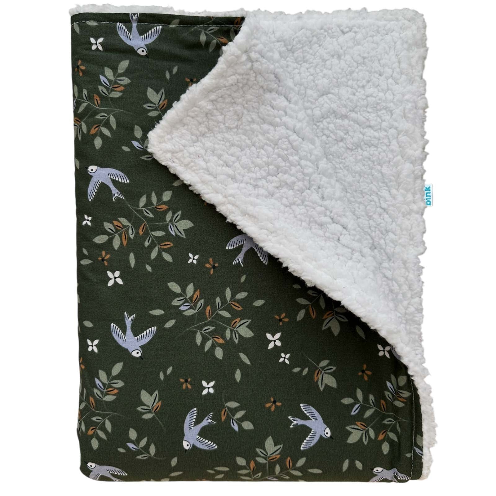 Deken Merel heeft aan de ene zijde de zachte, wollige off-white sherpa. Aan de andere zijde heeft deken Merel de mooie warme print met vogels en bloemen in verschillende tinten groen, lila en camel op een donkergroene ondergrond.