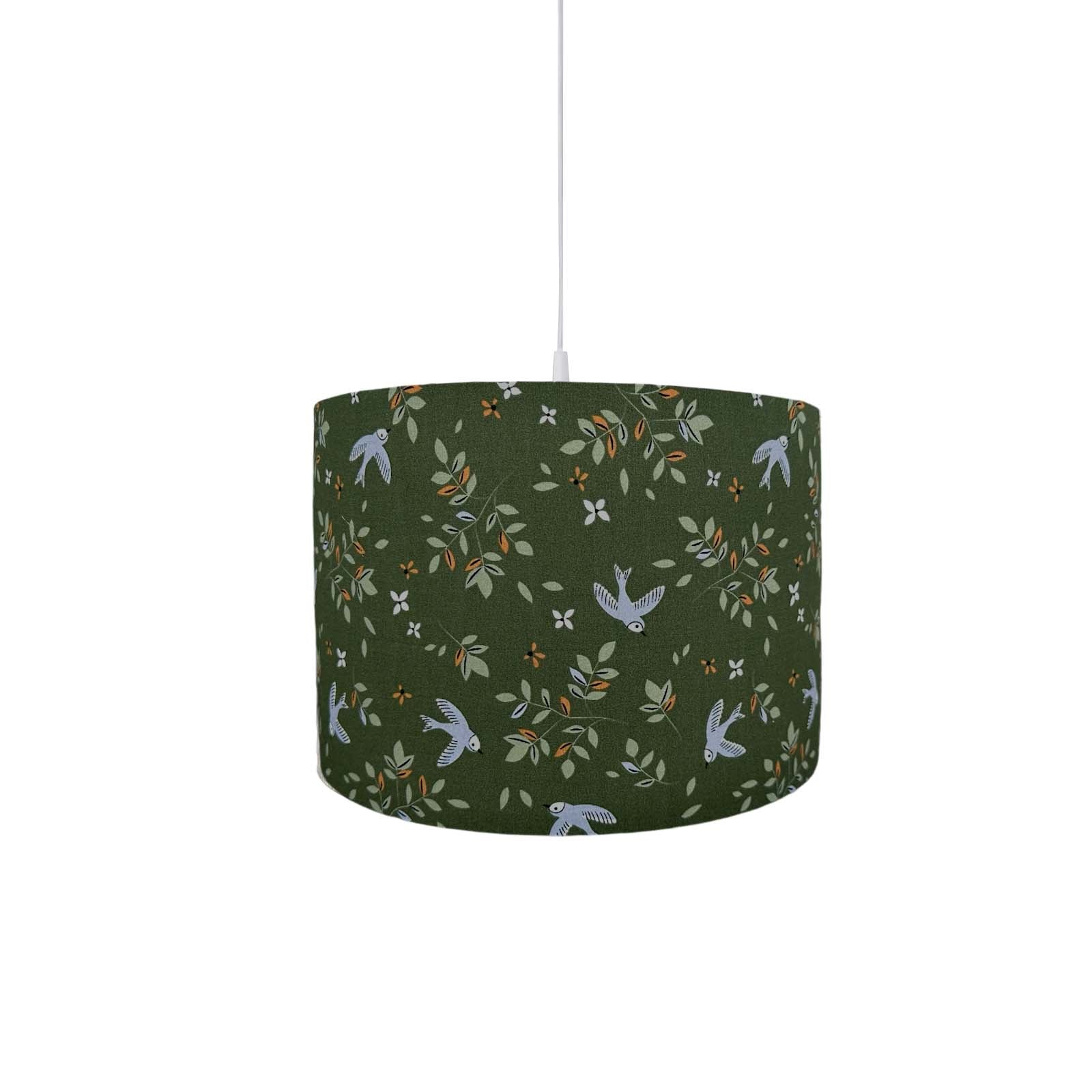 Lampenkap Merel heeft een warme uitstraling door de mooie print met bloemen en vogels in lila, licht groen en camel op een donkergroene ondergrond. Deze lampenkap is niet alleen geschikt als hanglamp maar ook als lampenkap voor een staande lamp.