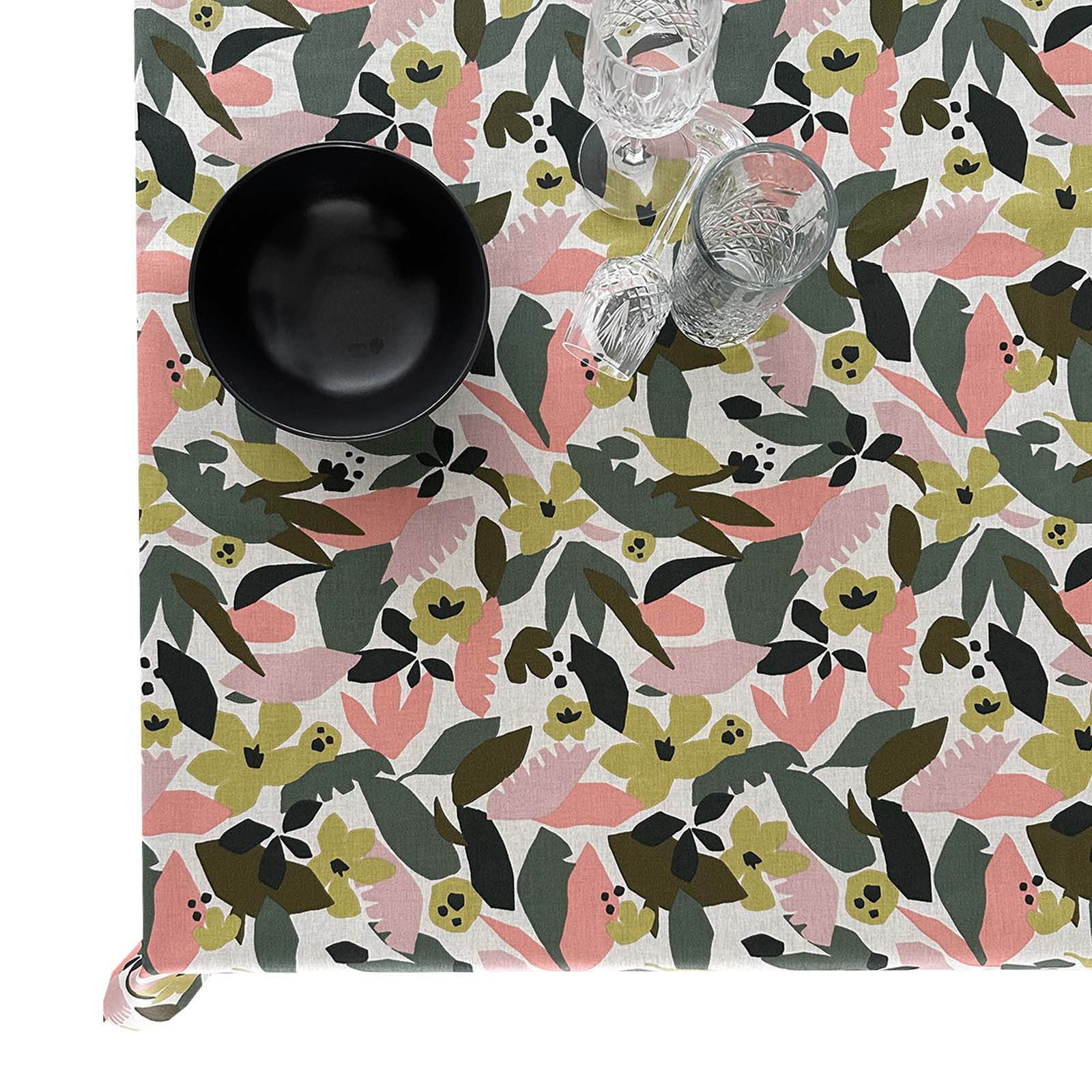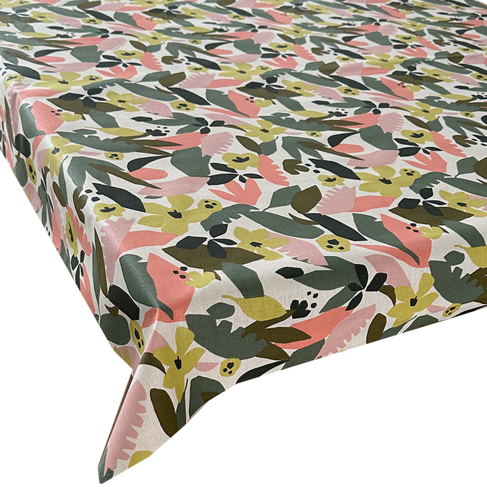 Het Soft Jungle tafelzeil maakt van elke maaltijd een ontspannen moment. De print, met zijn delicate bladeren en bloemen in zachte groentinten, okergeel en poederroze, straalt rust uit en past moeiteloos in zowel moderne als klassieke interieurs. Laat je inspireren door de natuurlijke kleuren en creëer een serene sfeer aan tafel, elke dag opnieuw.