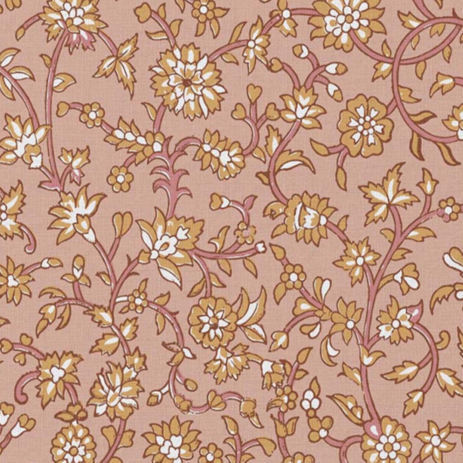 Warme bloemenprint in roze, bruin, goudgeel en offwhite op peachroze ondergrond